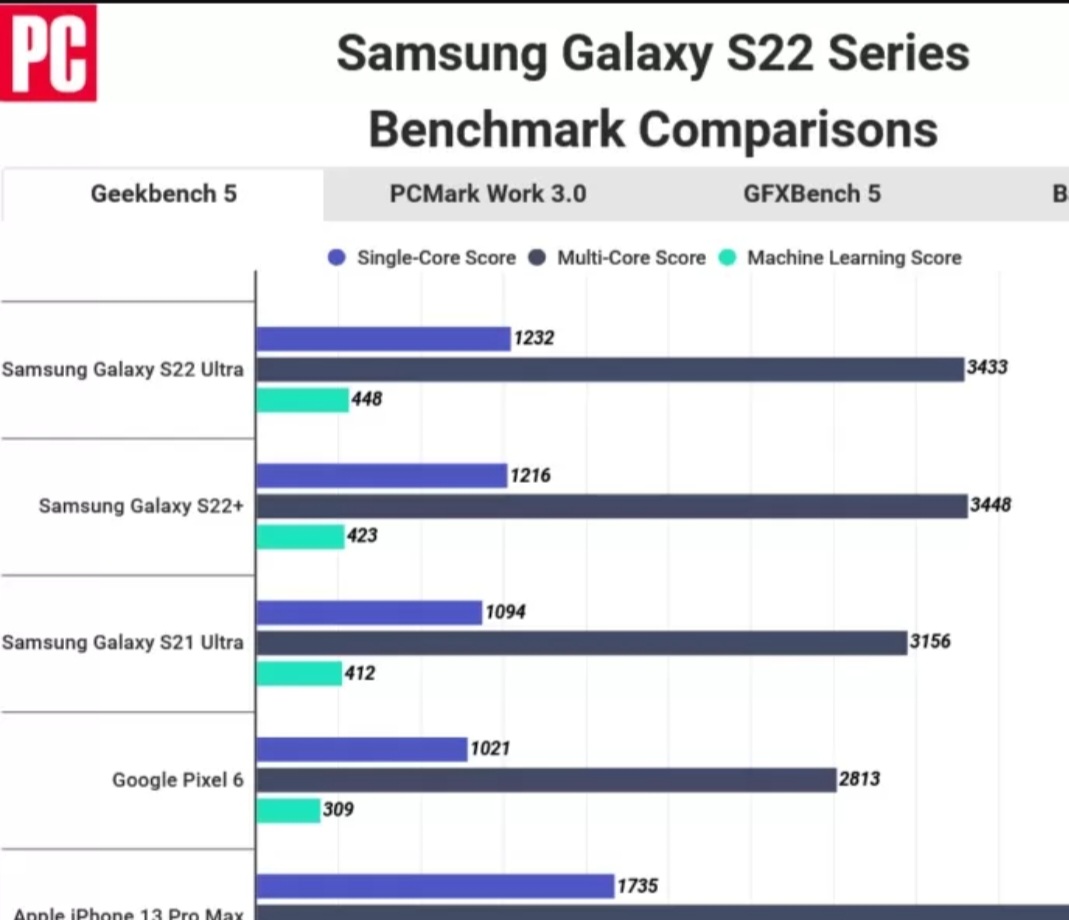 گوشی گلکسی S22 اولترا با تراشه اسنپدراگون ۸ نسل ۱ در بنچمارک گیکبنچ ۵ حضور پیدا کرده که نشان میدهد این گوشی موفق به کسب امتیاز ۳.۴۳۳ در آزمونهای چند هستهای شده است. این درحالیست که گوشی آیفون ۱۳ پرو مکس با چیپست A15 Bionic خودش موفق به کسب امتیاز ۴.۶۴۷ در این آزمونها شده است. نتایج در آزمونهای تک هستهای نیز به همین شکل است و در حالی که پرچمدار اپل امتیاز ۱.۷۳۵ را به نام خودش ثبت کرده، گوشی گلکسی اس ۲۲ اولترا امتیاز ۱.۲۳۲ را به دست آورده است.